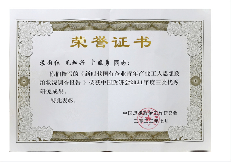 日前,中国政研会通报了2021年度优秀研究成果名单,由安徽省政研会选送、芜湖市产业工人队伍思想政治工作研究中心(以下简称“研究中心”)撰写的调研报告《新时代国有企业青年产业工人思想政治状况调查报告》喜获三类优秀研究成果。